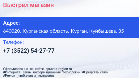 Выстрел, магазин по адресу 640020, Курганская область, Курган, Куйбышева, 35 в дальнейшем Организация, размещена в следующих категориях: