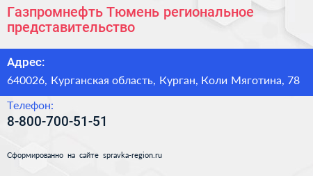 Газпромнефть-Тюмень, региональное представительство по адресу 640026, Курганская область, Курган, Коли Мяготина, 78 в дальнейшем Организация, размещена в следующих категориях: