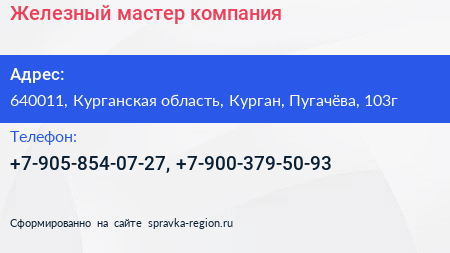 Железный мастер, компания по адресу 640011, Курганская область, Курган, Пугачёва, 103г в дальнейшем Организация, размещена в следующих категориях: