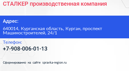 СТАЛКЕР, производственная компания по адресу 640014, Курганская область, Курган, проспект Машиностроителей, 24/1 в дальнейшем Организация, размещена в следующих категориях: