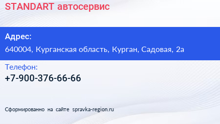 STANDART, автосервис по адресу 640004, Курганская область, Курган, Садовая, 2а в дальнейшем Организация, размещена в следующих категориях: