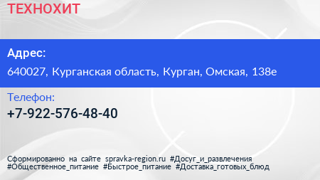 ТЕХНОХИТ по адресу 640027, Курганская область, Курган, Омская, 138е в дальнейшем Организация, размещена в следующих категориях: