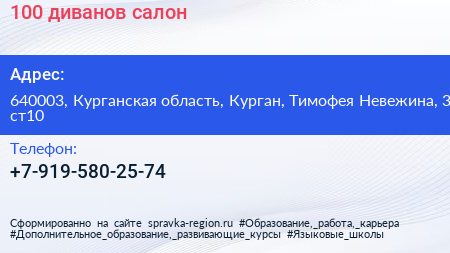 100 диванов, салон по адресу 640003, Курганская область, Курган, Тимофея Невежина, 3 ст10 в дальнейшем Организация, размещена в следующих категориях: