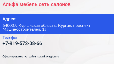 Альфа мебель, сеть салонов по адресу 640007, Курганская область, Курган, проспект Машиностроителей, 1а в дальнейшем Организация, размещена в следующих категориях:
