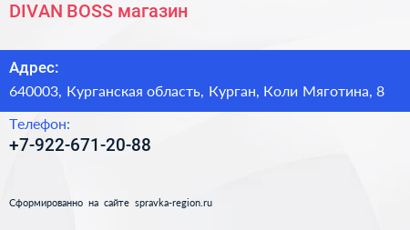 DIVAN BOSS, магазин по адресу 640003, Курганская область, Курган, Коли Мяготина, 8 в дальнейшем Организация, размещена в следующих категориях: