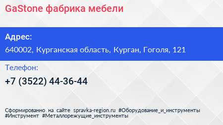 GaStone, фабрика мебели по адресу 640002, Курганская область, Курган, Гоголя, 121 в дальнейшем Организация, размещена в следующих категориях: