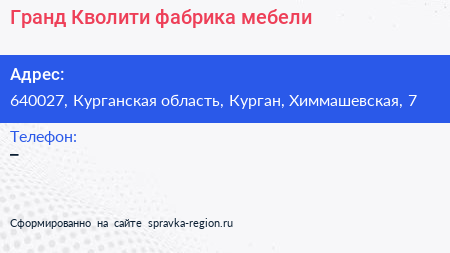 Гранд Кволити, фабрика мебели по адресу 640027, Курганская область, Курган, Химмашевская, 7 в дальнейшем Организация, размещена в следующих категориях: