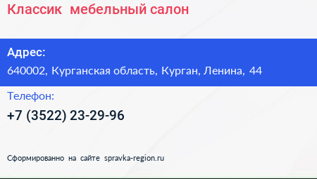 Классик+, мебельный салон по адресу 640002, Курганская область, Курган, Ленина, 44 в дальнейшем Организация, размещена в следующих категориях: