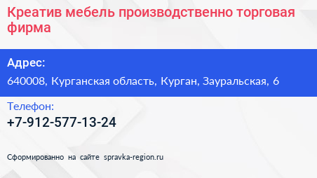 Креатив мебель, производственно-торговая фирма по адресу 640008, Курганская область, Курган, Зауральская, 6 в дальнейшем Организация, размещена в следующих категориях:
