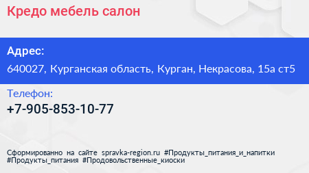 Кредо мебель, салон по адресу 640027, Курганская область, Курган, Некрасова, 15а ст5 в дальнейшем Организация, размещена в следующих категориях:
