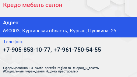Кредо мебель, салон по адресу 640003, Курганская область, Курган, Пушкина, 25 в дальнейшем Организация, размещена в следующих категориях: