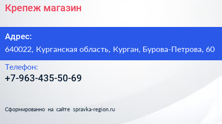 Крепеж, магазин по адресу 640022, Курганская область, Курган, Бурова-Петрова, 60 в дальнейшем Организация, размещена в следующих категориях: