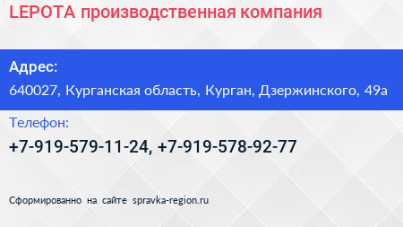 LEPOTA, производственная компания по адресу 640027, Курганская область, Курган, Дзержинского, 49а в дальнейшем Организация, размещена в следующих категориях: