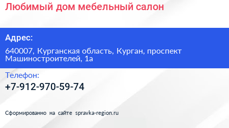 Любимый дом, мебельный салон по адресу 640007, Курганская область, Курган, проспект Машиностроителей, 1а в дальнейшем Организация, размещена в следующих категориях: