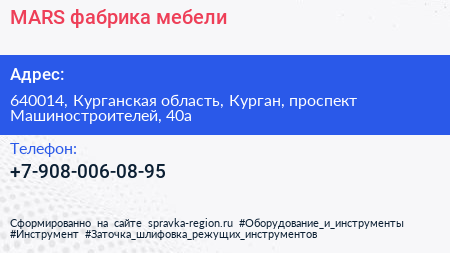 MARS, фабрика мебели по адресу 640014, Курганская область, Курган, проспект Машиностроителей, 40а в дальнейшем Организация, размещена в следующих категориях: