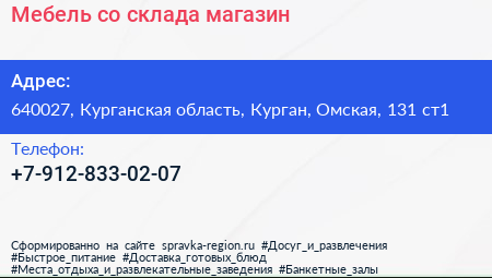 Мебель со склада, магазин по адресу 640027, Курганская область, Курган, Омская, 131 ст1 в дальнейшем Организация, размещена в следующих категориях: