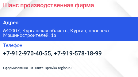 Шанс, производственная фирма по адресу 640007, Курганская область, Курган, проспект Машиностроителей, 1а в дальнейшем Организация, размещена в следующих категориях: