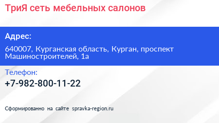 ТриЯ, сеть мебельных салонов по адресу 640007, Курганская область, Курган, проспект Машиностроителей, 1а в дальнейшем Организация, размещена в следующих категориях: