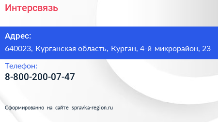 Интерсвязь по адресу 640023, Курганская область, Курган, 4-й микрорайон, 23 в дальнейшем Организация, размещена в следующих категориях:
