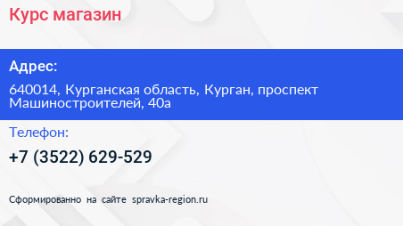 Курс, магазин по адресу 640014, Курганская область, Курган, проспект Машиностроителей, 40а в дальнейшем Организация, размещена в следующих категориях: