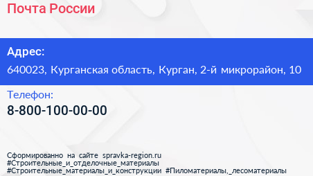 Почта России по адресу 640023, Курганская область, Курган, 2-й микрорайон, 10 в дальнейшем Организация, размещена в следующих категориях: