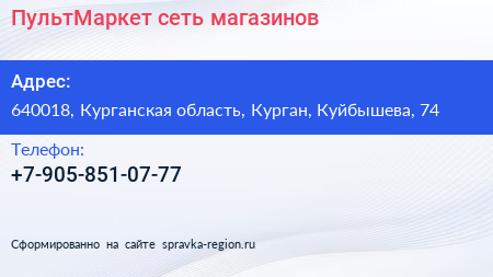 ПультМаркет, сеть магазинов по адресу 640018, Курганская область, Курган, Куйбышева, 74 в дальнейшем Организация, размещена в следующих категориях: