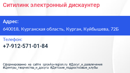 Ситилинк, электронный дискаунтер по адресу 640018, Курганская область, Курган, Куйбышева, 72Б в дальнейшем Организация, размещена в следующих категориях: