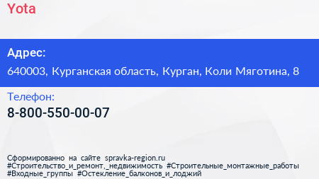 Yota по адресу 640003, Курганская область, Курган, Коли Мяготина, 8 в дальнейшем Организация, размещена в следующих категориях: