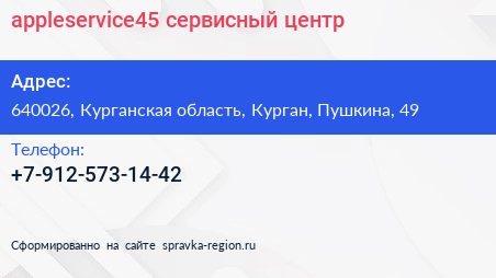 appleservice45, сервисный центр по адресу 640026, Курганская область, Курган, Пушкина, 49 в дальнейшем Организация, размещена в следующих категориях: