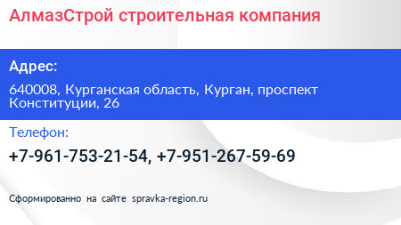 АлмазСтрой, строительная компания по адресу 640008, Курганская область, Курган, проспект Конституции, 26 в дальнейшем Организация, размещена в следующих категориях: