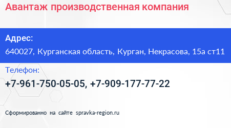 Авантаж, производственная компания по адресу 640027, Курганская область, Курган, Некрасова, 15а ст11 в дальнейшем Организация, размещена в следующих категориях: