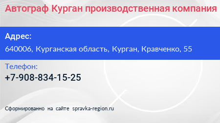 Автограф-Курган, производственная компания по адресу 640006, Курганская область, Курган, Кравченко, 55 в дальнейшем Организация, размещена в следующих категориях: