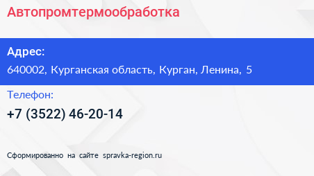 Автопромтермообработка по адресу 640002, Курганская область, Курган, Ленина, 5 в дальнейшем Организация, размещена в следующих категориях: