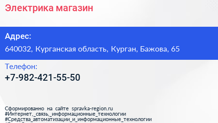 Электрика, магазин по адресу 640032, Курганская область, Курган, Бажова, 65 в дальнейшем Организация, размещена в следующих категориях:
