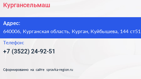 Кургансельмаш по адресу 640006, Курганская область, Курган, Куйбышева, 144 ст51 в дальнейшем Организация, размещена в следующих категориях: