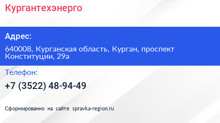 Кургантехэнерго по адресу 640008, Курганская область, Курган, проспект Конституции, 29а в дальнейшем Организация, размещена в следующих категориях: