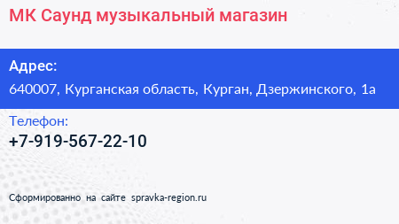МК-Саунд, музыкальный магазин по адресу 640007, Курганская область, Курган, Дзержинского, 1а в дальнейшем Организация, размещена в следующих категориях: