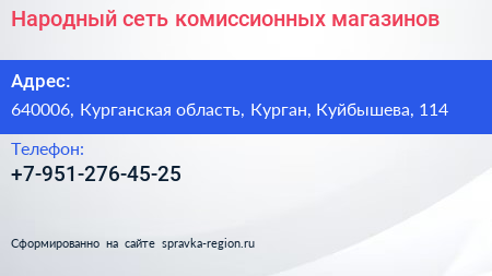 Народный, сеть комиссионных магазинов по адресу 640006, Курганская область, Курган, Куйбышева, 114 в дальнейшем Организация, размещена в следующих категориях: