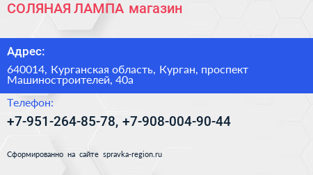 СОЛЯНАЯ ЛАМПА, магазин по адресу 640014, Курганская область, Курган, проспект Машиностроителей, 40а в дальнейшем Организация, размещена в следующих категориях: