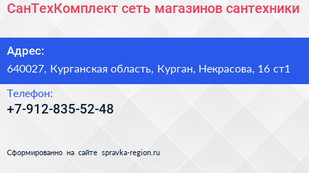 СанТехКомплект, сеть магазинов сантехники по адресу 640027, Курганская область, Курган, Некрасова, 16 ст1 в дальнейшем Организация, размещена в следующих категориях: