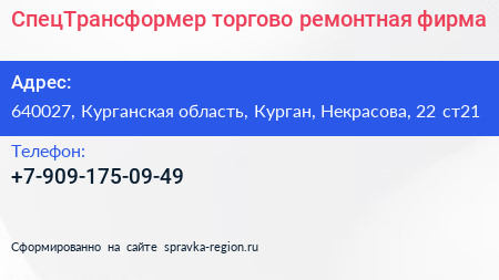 СпецТрансформер, торгово-ремонтная фирма по адресу 640027, Курганская область, Курган, Некрасова, 22 ст21 в дальнейшем Организация, размещена в следующих категориях: