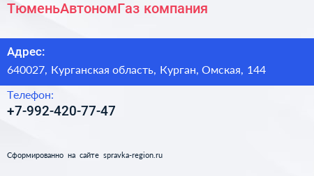 ТюменьАвтономГаз, компания по адресу 640027, Курганская область, Курган, Омская, 144 в дальнейшем Организация, размещена в следующих категориях: