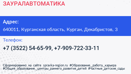 ЗАУРАЛАВТОМАТИКА по адресу 640011, Курганская область, Курган, Декабристов, 3 в дальнейшем Организация, размещена в следующих категориях: