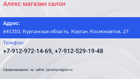 Алекс, магазин-салон по адресу 641310, Курганская область, Курган, Космонавтов, 27 в дальнейшем Организация, размещена в следующих категориях: