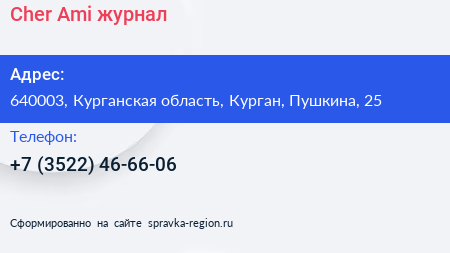 Cher Ami, журнал по адресу 640003, Курганская область, Курган, Пушкина, 25 в дальнейшем Организация, размещена в следующих категориях: