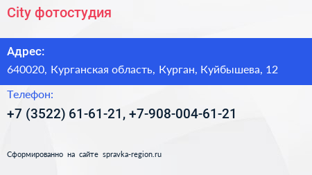 City, фотостудия по адресу 640020, Курганская область, Курган, Куйбышева, 12 в дальнейшем Организация, размещена в следующих категориях: