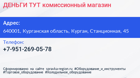 ДЕНЬГИ ТУТ, комиссионный магазин по адресу 640001, Курганская область, Курган, Станционная, 45 в дальнейшем Организация, размещена в следующих категориях: