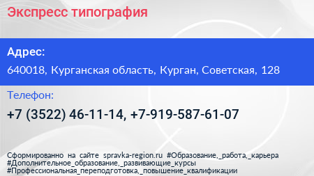 Экспресс, типография по адресу 640018, Курганская область, Курган, Советская, 128 в дальнейшем Организация, размещена в следующих категориях: