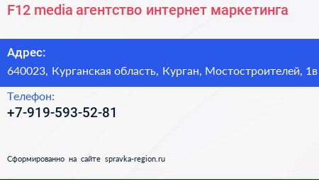 F12.media, агентство интернет-маркетинга по адресу 640023, Курганская область, Курган, Мостостроителей, 1в в дальнейшем Организация, размещена в следующих категориях: