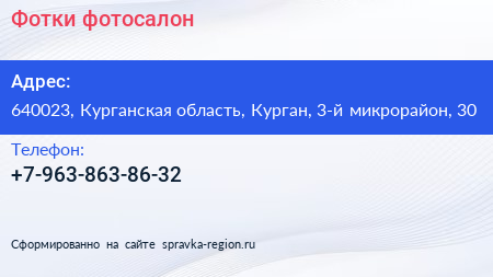 Фотки, фотосалон по адресу 640023, Курганская область, Курган, 3-й микрорайон, 30 в дальнейшем Организация, размещена в следующих категориях:
